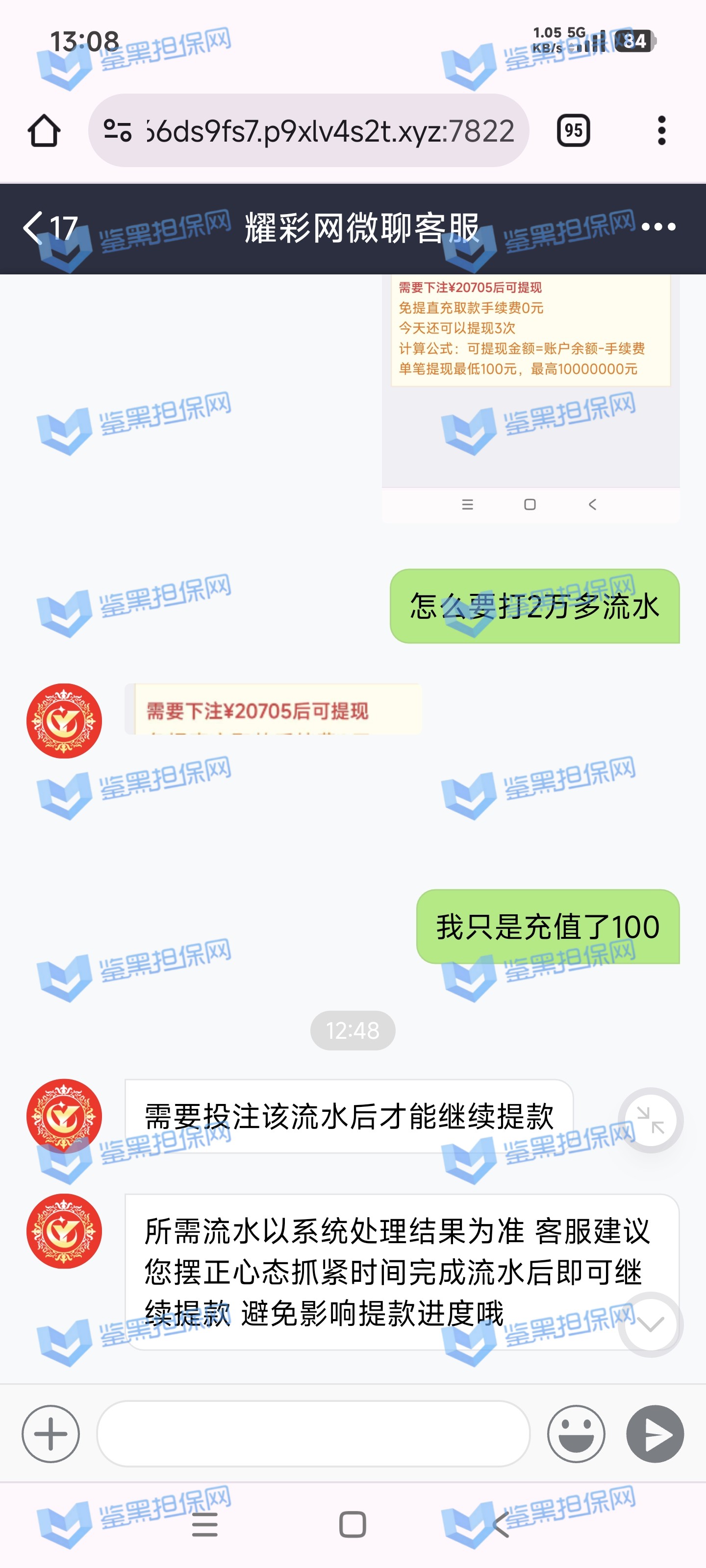 5、由于该平台坚持需要玩家完成100倍流水才可以提款,拒绝更多沟通且未提供对打记录核实,故以曝光展示,鉴黑担保网再次提醒广大玩家,请遵守娱乐城的规章制度,保持正常投注游戏,以免违规投注给你的账户资金带来风险!